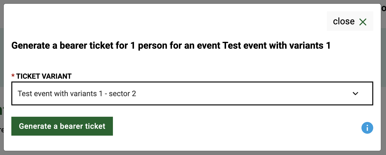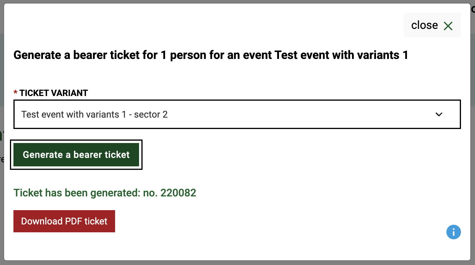 Generating a bearer ticket in the "click" edition of the event. In the case of an event with ticket variants, select the ticket variant from the list.