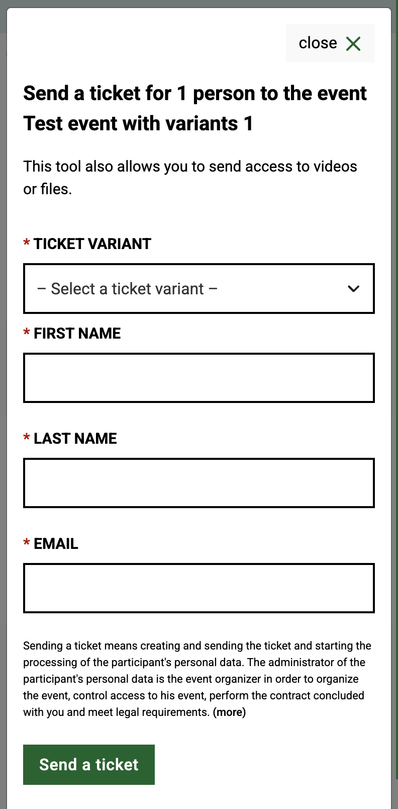 The participant first provides his name and surname and e-mail address. Then you generate a ticket, and the participant receives an email with a PDF ticket.